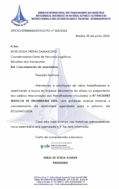 Novo OFICIO – 3035 Cancelamento de Assembleia Ministério do Transporte